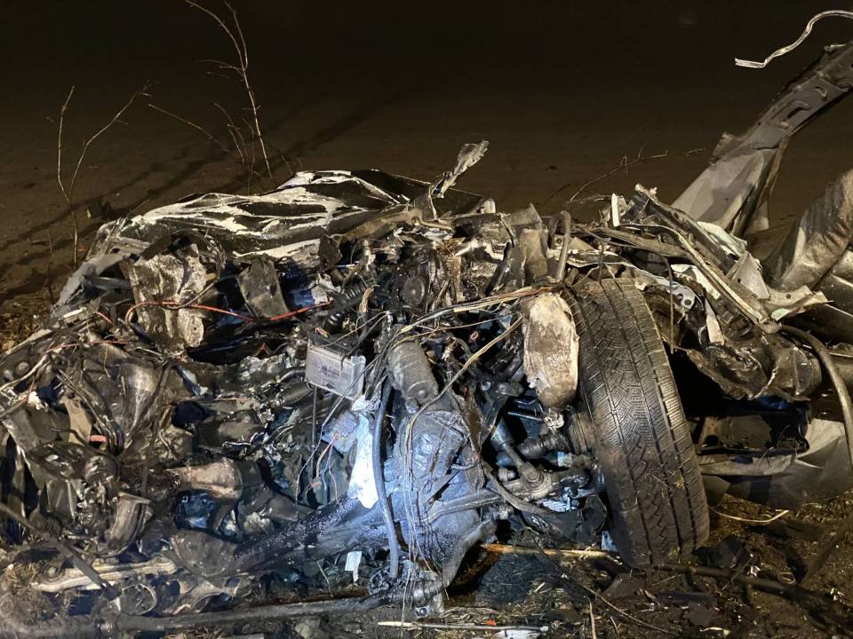 Auto osobowe zostało doszczętnie zmiażdżone przez pojazd ciężarowy. Trudno było określić poszczególne części pojazdu oraz dokładny model.