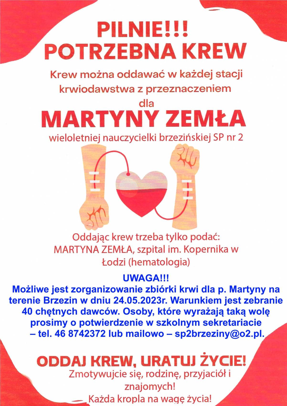 Szkoła Podstawowa nr 2 im. Andrzeja Frycza Modrzewskiego w Brzezinach wystosowała apel o oddawanie krewi dla wieloletniej nauczycielki Martyny Zemła.
