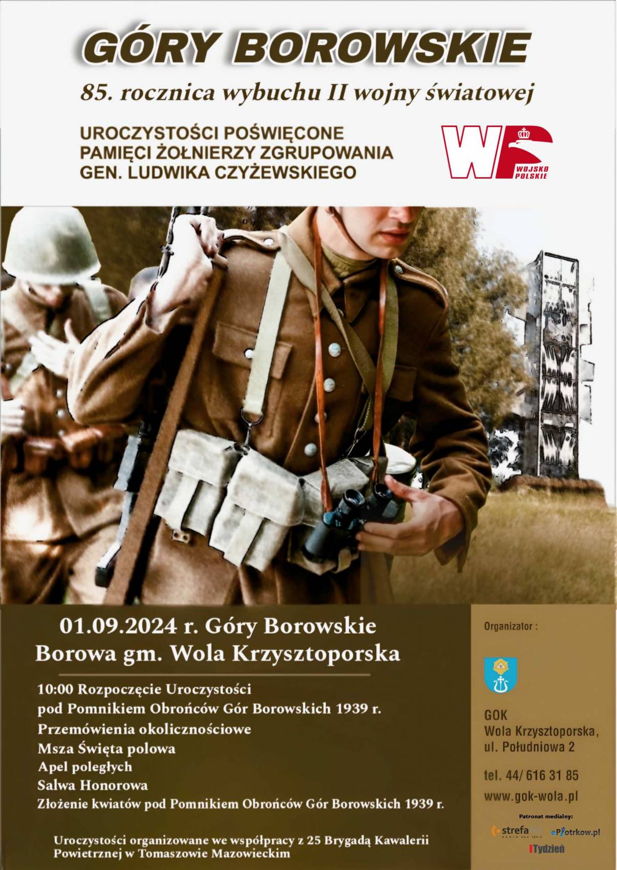 Już w najbliższą niedzielę (1 września) obchodzić będziemy 85. rocznicę wybuchu II wojny światowej. Wójt i Rada Gminy Wola Krzysztoporska oraz Gminny Ośrodek Kultury mają zaszczyt zaprosić na uroczystości poświęcone pamięci żołnierzy ze zgrupowania gen. Ludwika Czyżewskiego.
