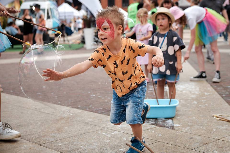 W niedzielę na rynku w Manufakturze bawiły się całe rodziny. Na dzieci czekała moc bezpłatnych atrakcji m.in. strzelnica z puszkami, w której można było wygrać gigantyczne maskotki, dmuchańce, warsztaty ludowe, pokazy baniec, malowanie buziek i brokatowych tatuaży. Były animacje oraz smaczne przekąski m.in. wata cukrowa, owoce w czekoladzie, frytki, churrosy, napoje i zakręcone ziemniaczki.